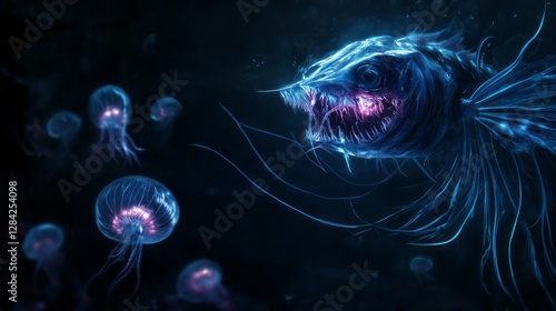 Wall mural deep sea anglerfish illuminated with bioluminescent jellyfish in dark ocean