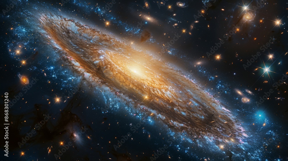 The watermark will not be included on Wall mural.: Deep space image featuring a spiral galaxy with a glowing core and extensive star fields generative