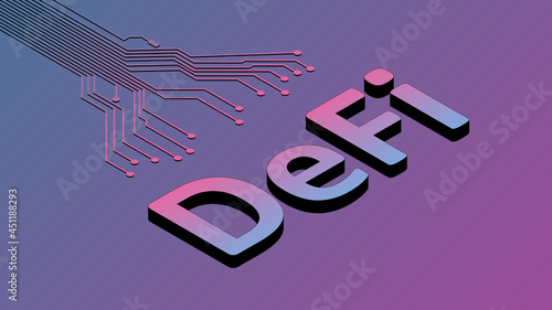 The watermark will not be included on Wall mural.: Defi - decentralized finance, isometric text with pcb tracks on purple background - ecosystem of fina