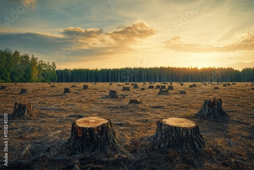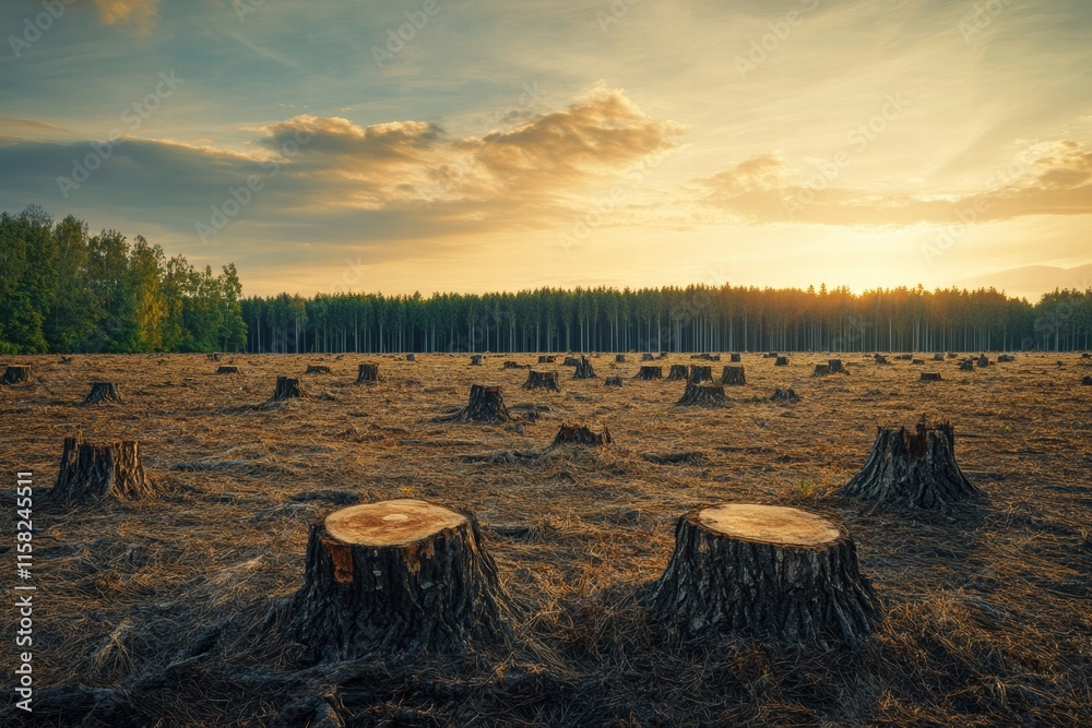 Wall mural deforested area reveals tree stumps under a colorful sky at sunset in a once lush forest. generative