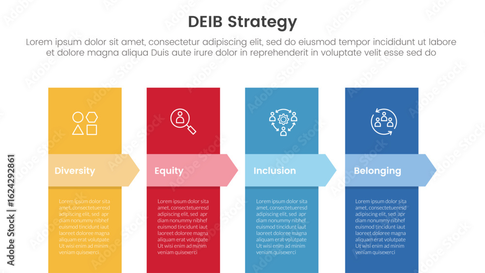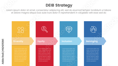 The watermark will not be included on Wall mural.: Deib diversity strategy infographic 4 point stage template with vertical box and arrow badge header