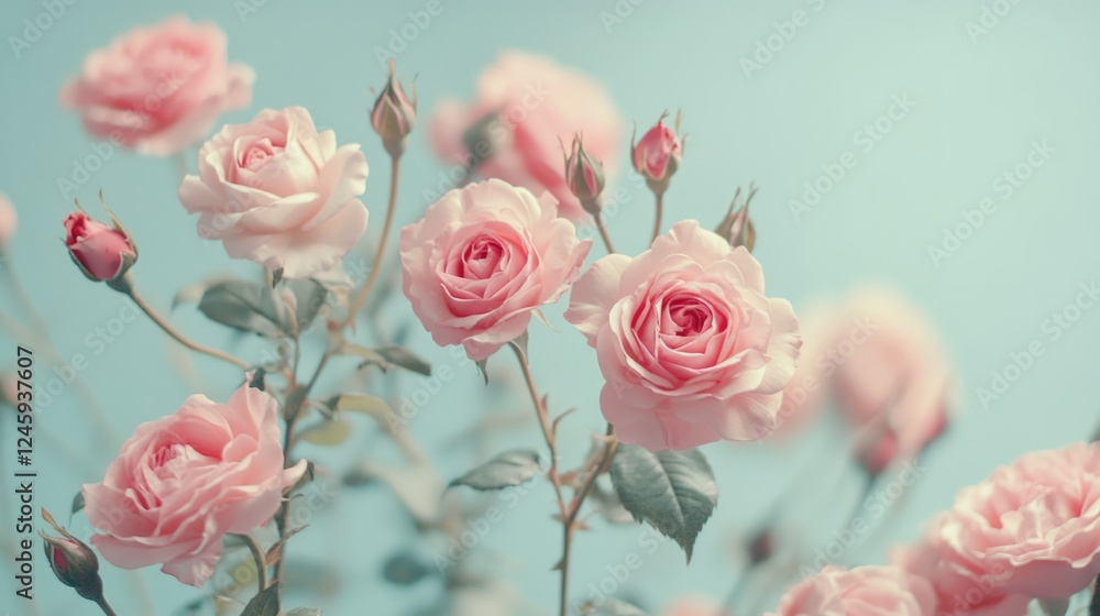 The watermark will not be included on Wall mural.: Delicate pink roses against a soft blue background creating a serene atmosphere with ample space for