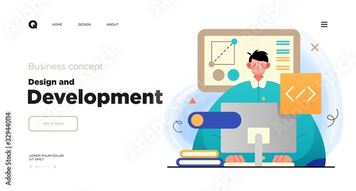 Wall mural : Design and development - landing page template with programmer or designer working in a company offic