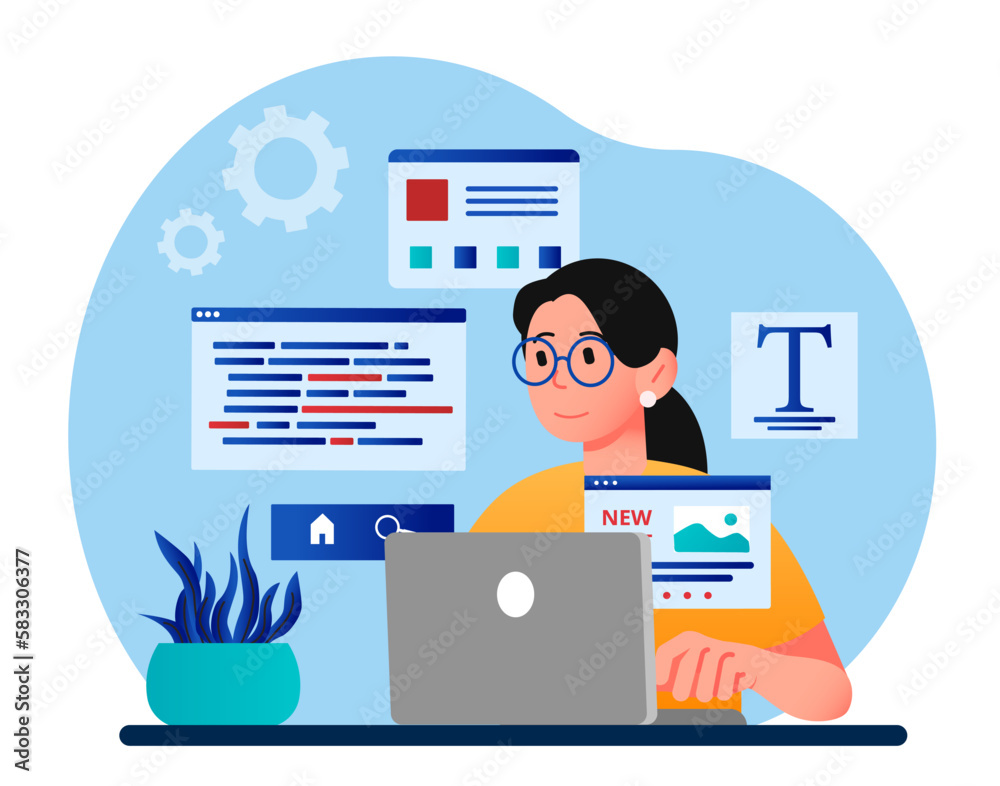 The watermark will not be included on Wall mural.: Design and programming concept - woman behind laptop develops website page, interface for programs an