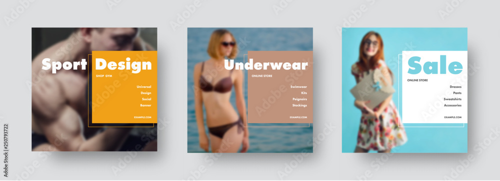 Wall mural : Design of square banners for social networks with photo on the background and rectangles and stroke