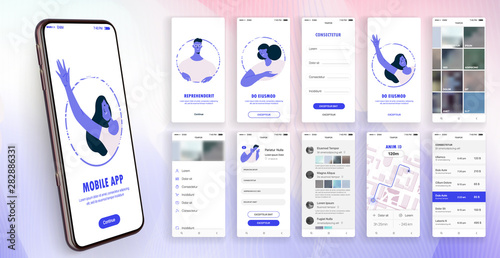 Wall mural design of the mobile application, ui, ux. a set of gui screens with login and password input, home p