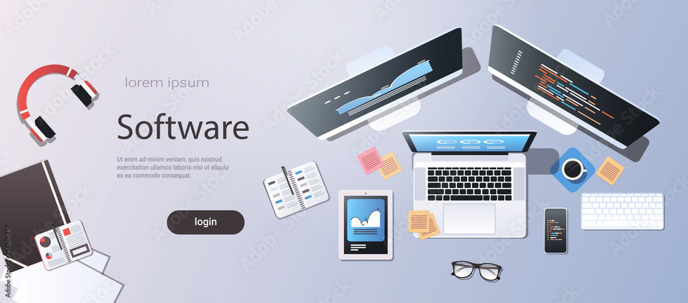 Design software development programming concept top angle view desktop computer monitor tablet smartWall mural