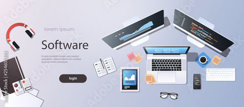 Wall mural design software development programming concept top angle view desktop computer monitor tablet smart - Wall murals Wall mural design software development programming concept top angle view desktop computer monitor tablet smart - Wall murals