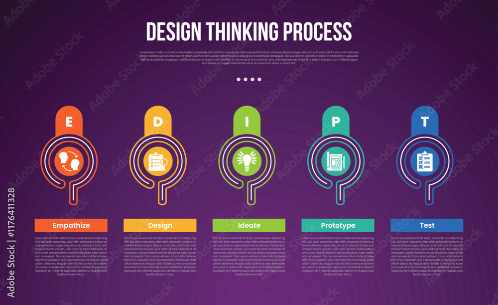 The watermark will not be included on Wall mural.: Design thinking process infographic outline style with 5 point template with creative outline circle