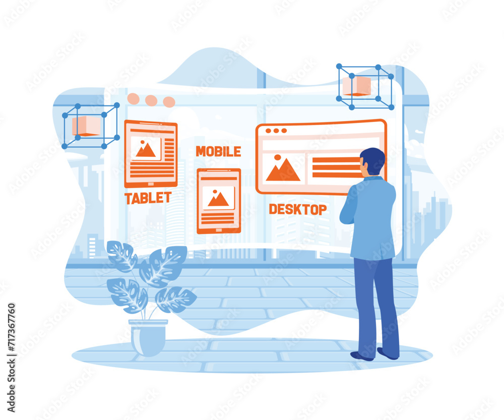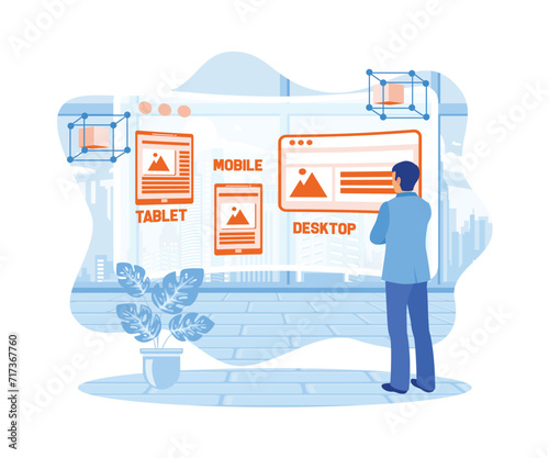 Wall mural designer sketches wireframe layout design on virtual screen. developing websites on electronic devic