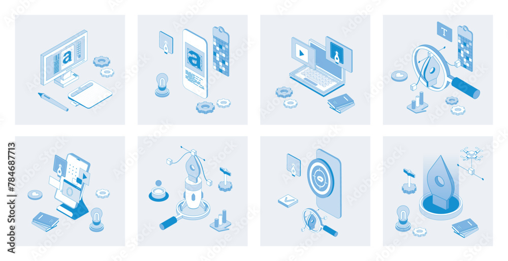 Wall mural designer studio 3d isometric concept set with isometric icons design for web. collection of drawing