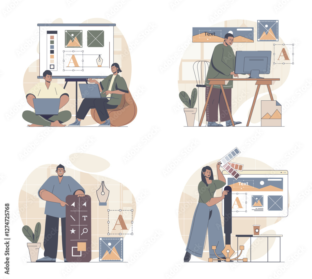 Wall mural designer studio concept scenes set in flat web design. people in situations of working in agency, cr - Wall murals Wall mural designer studio concept scenes set in flat web design. people in situations of working in agency, cr - Wall murals