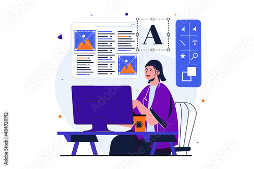 Wall mural : Designer studio modern flat concept for web banner design - woman works at computer, develops layout