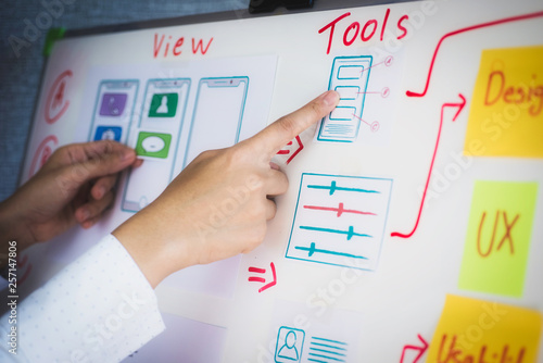 Wall mural : Designer women of planning website and sketch drawing template layout for application developing in