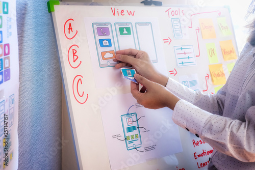 Designer women of planning website and sketch drawing template layout for application developing in Wall mural