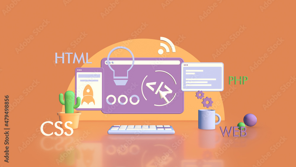 Wall mural desktop computer with keywords and symbols about web development, pastel colours (3d render)