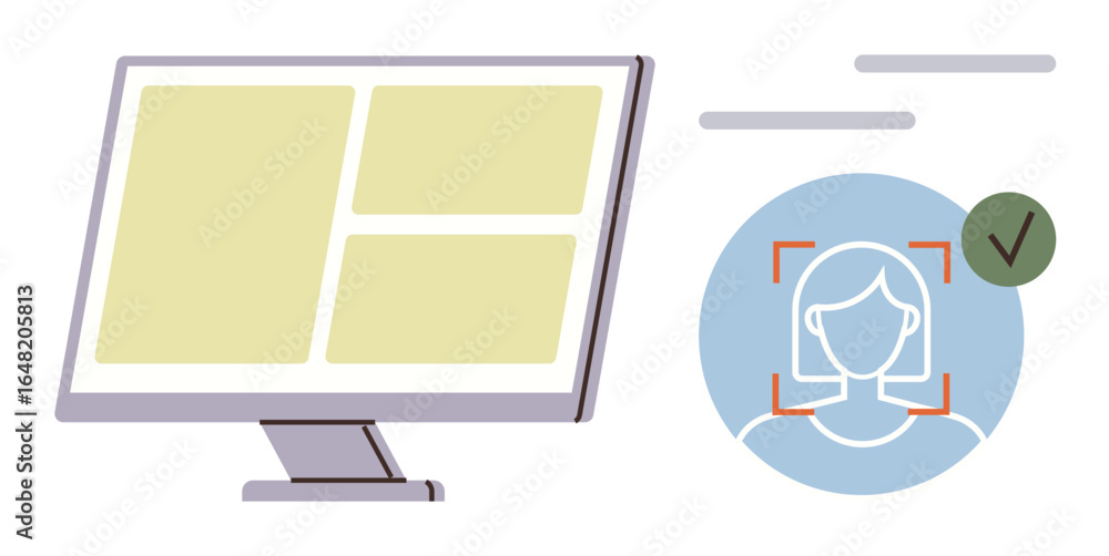 Wall mural desktop monitor with multiple panels and face scanning icon with verification checkmark. ideal for t - Wall murals Wall mural desktop monitor with multiple panels and face scanning icon with verification checkmark. ideal for t - Wall murals