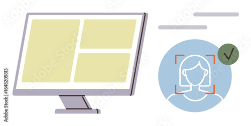 Wall mural : Desktop monitor with multiple panels and face scanning icon with verification checkmark - ideal for t