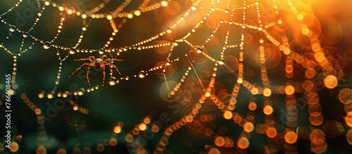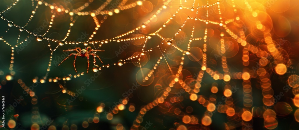 The watermark will not be included on Wall mural.: Detailed close-up of a spider web covered in glistening dew droplets, showcasing the intricate patte