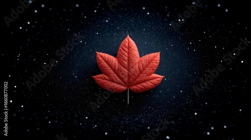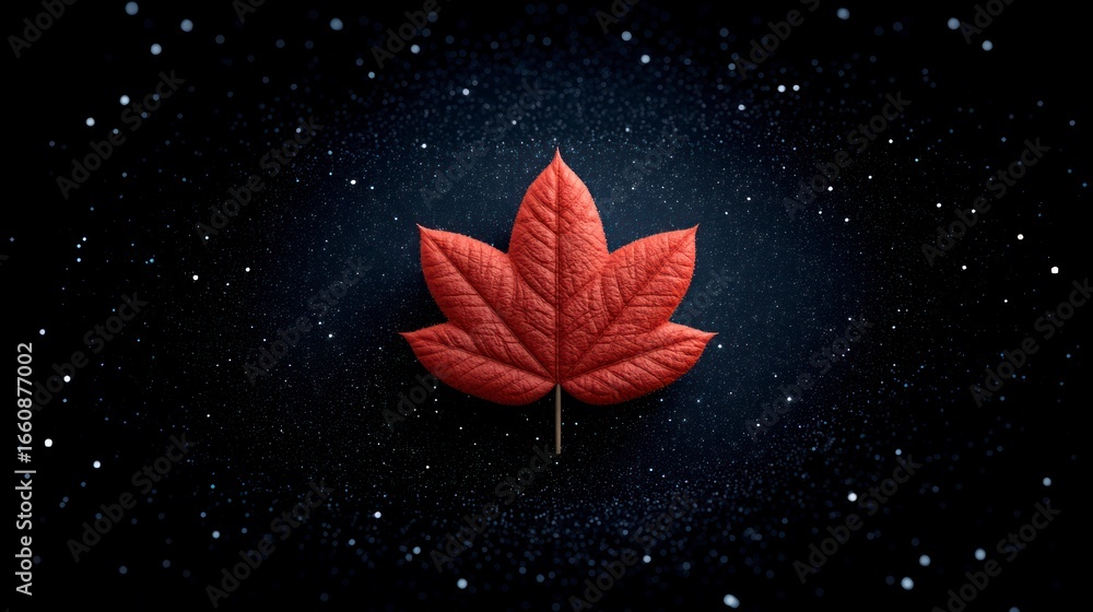 Wall mural detailed red maple leaf centered on a dark textured background with scattered white dots - Wall murals Wall mural detailed red maple leaf centered on a dark textured background with scattered white dots - Wall murals