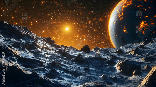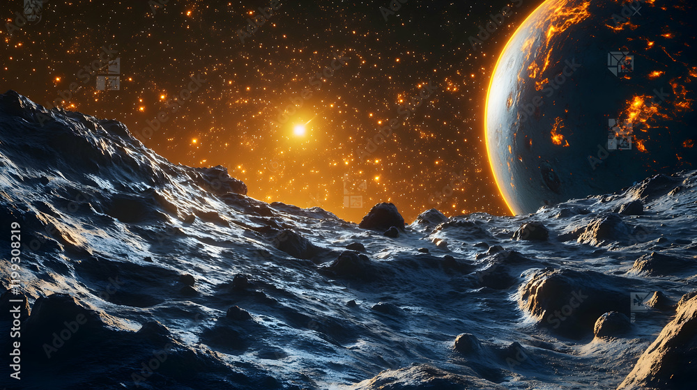 The watermark will not be included on Wall mural.: Detailed rendering of planets in a solar system with vibrant textures and glowing atmospheric effect