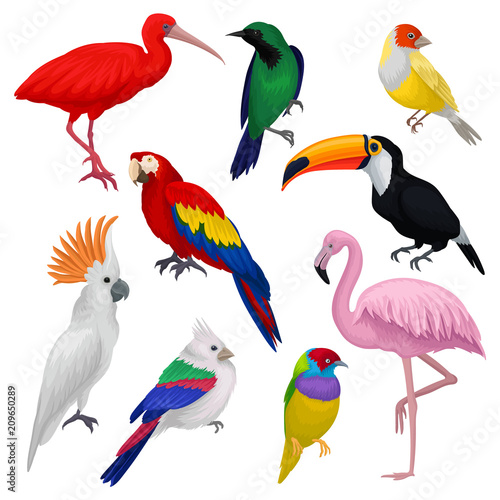 Wall mural detailed vector set of various exotic birds. wild creatures with colorful feathers. fauna and wildli