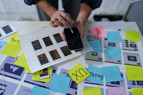 Wall mural developer, ui, ux designer, mobile app interface creation process, wireframe on the work desk for mo - Wall murals Wall mural developer, ui, ux designer, mobile app interface creation process, wireframe on the work desk for mo - Wall murals
