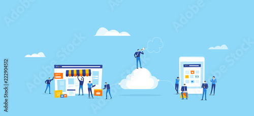 Wall mural : Developer and designer team create online shop and connect on cloud for online user concept