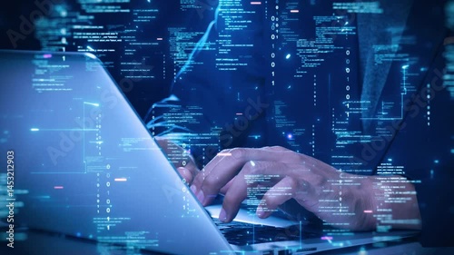 Wall mural : Developer hand typing on laptop with abstract digital code, programming, glowing blue data stream, r