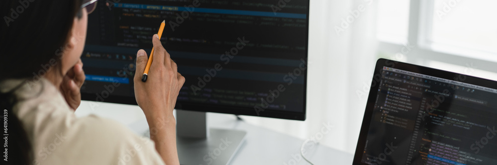 Wall mural developer programmer holds pencil and checking code on monitor while programming to developing web - Wall murals Wall mural developer programmer holds pencil and checking code on monitor while programming to developing web - Wall murals