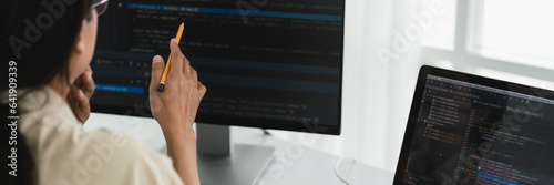 Wall mural : Developer programmer holds pencil and checking code on monitor while programming to developing web