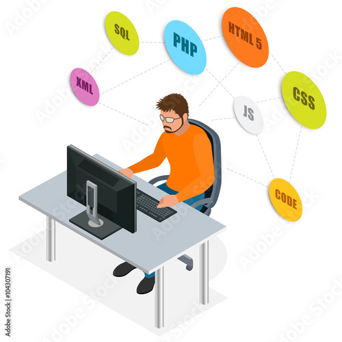 Wall mural developer using laptop computer. web development concept. web programming concept. programming, codi