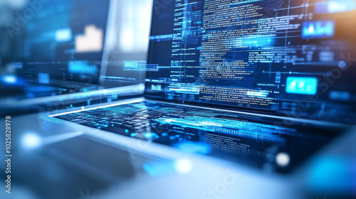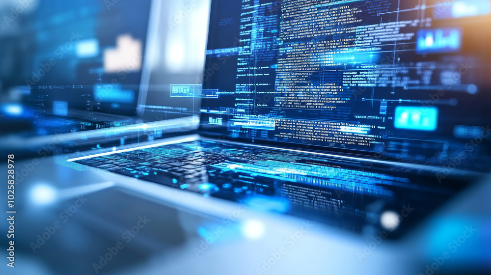 Wall mural developing software involves writing code, testing it on a laptop, and seeing the program code on th - Wall murals Wall mural developing software involves writing code, testing it on a laptop, and seeing the program code on th - Wall murals