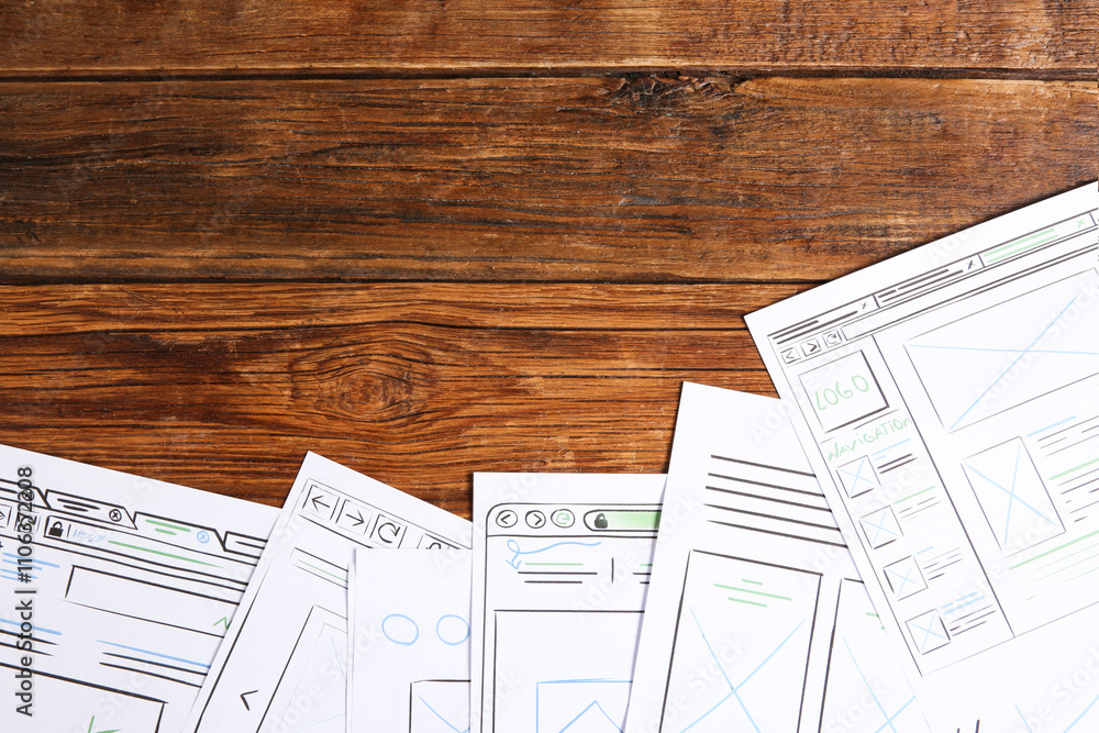 Developing ui design - sketches of website wireframes on wooden table, top viewWall mural