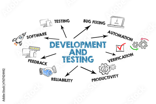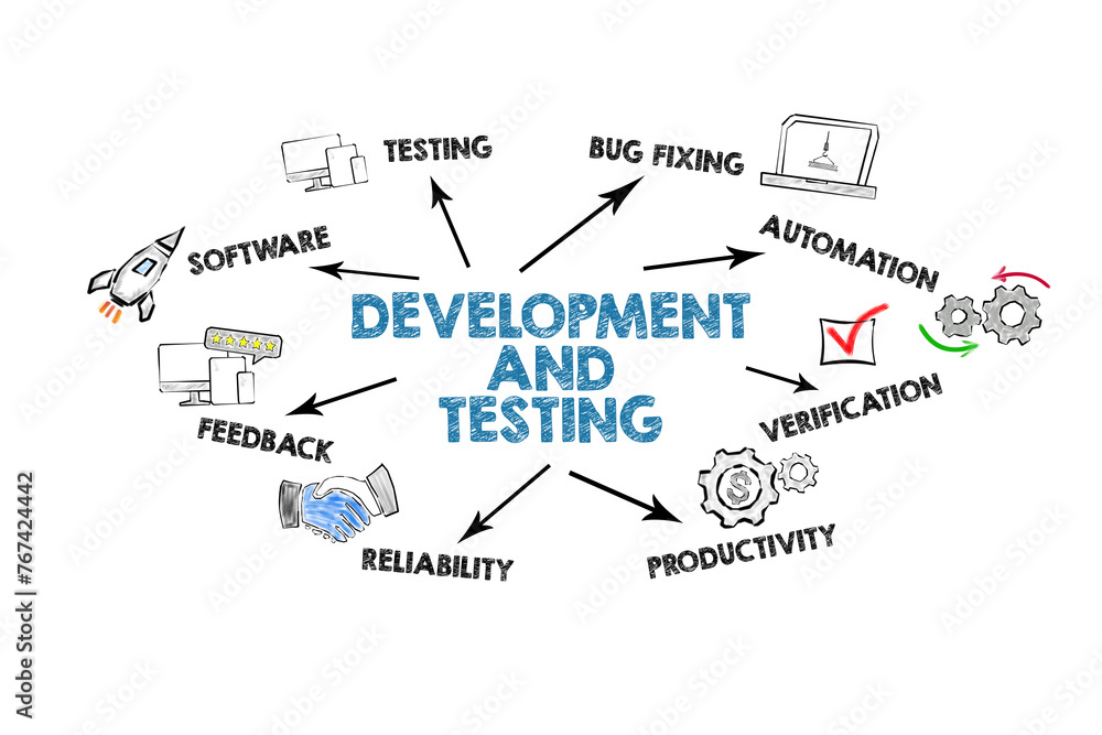 The watermark will not be included on Wall mural.: Development and testing concept - illustration with icons, keywords and arrows on a white background
