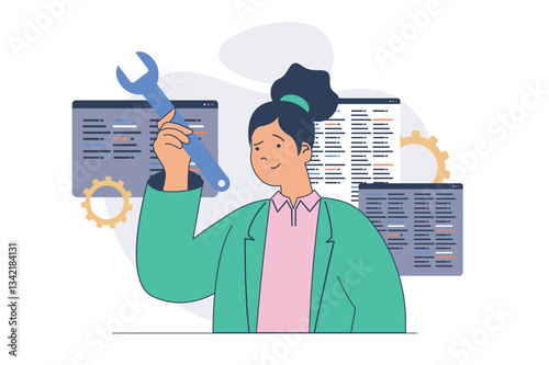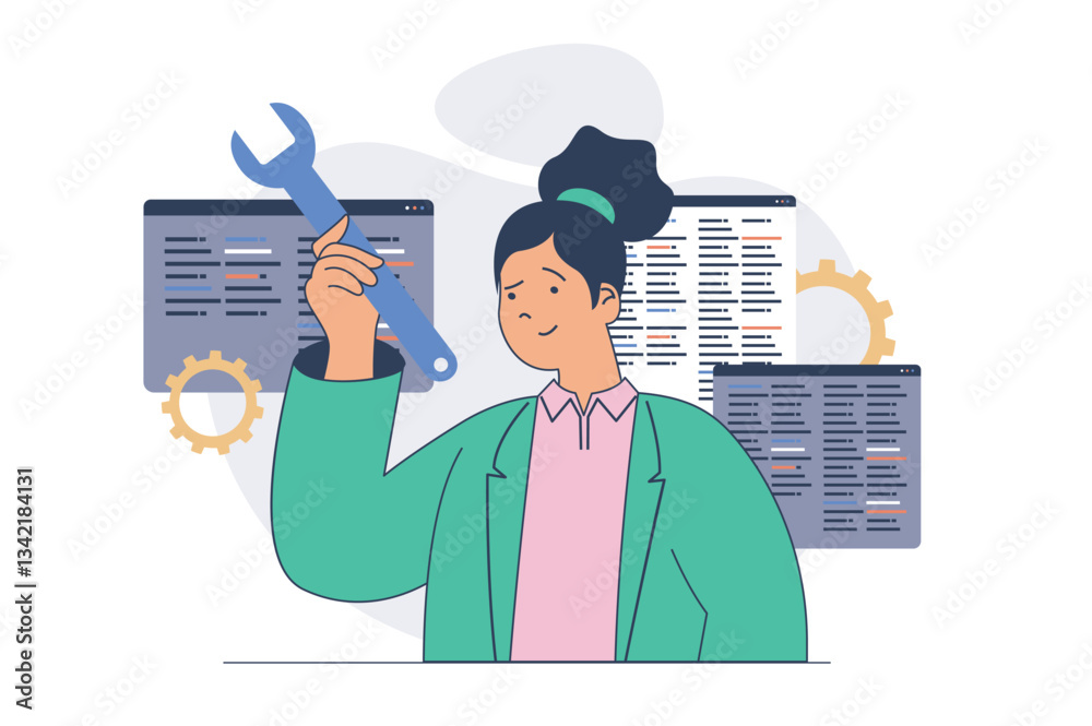 The watermark will not be included on Wall mural.: Development concept with cartoon people in flat design for web - woman programming and coding, examin