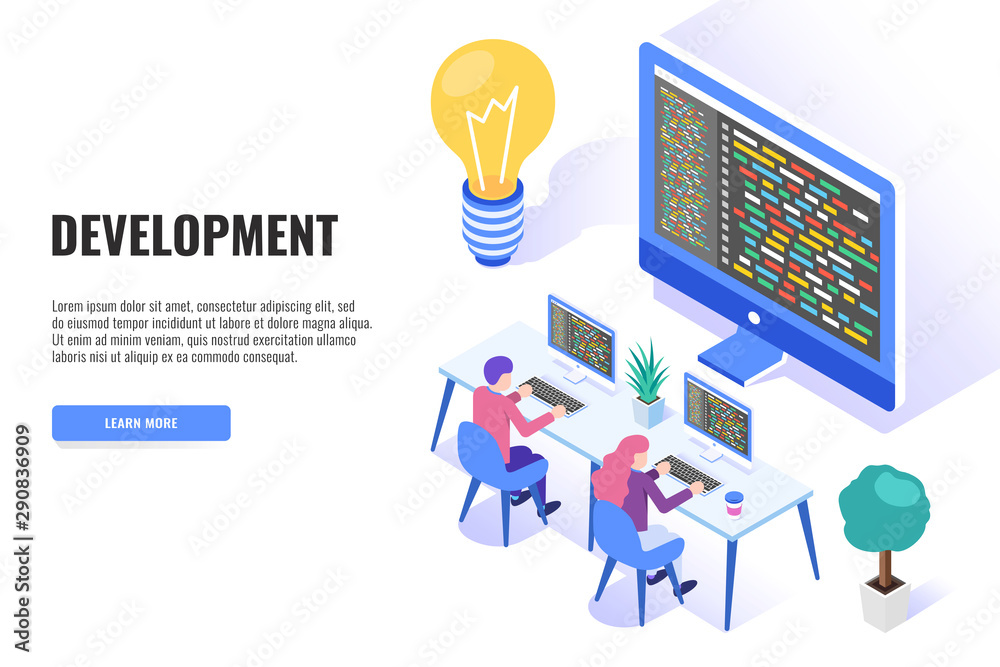 Wall mural : Development concept - team working on desktop computers - web banner, infographics - isometric vector i