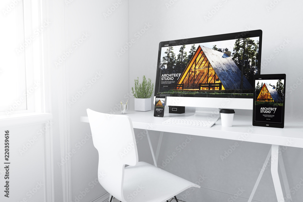 The watermark will not be included on Wall mural.: Devices on white minimal workspace architect website