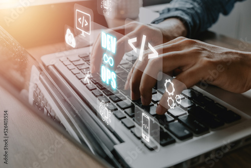 Wall mural : Devops concept, woman hand using laptop computer with devops icon on vr screen on desk, methodology