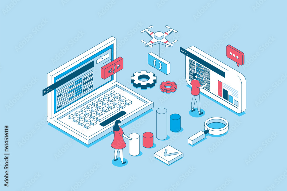 The watermark will not be included on Wall mural.: Devops concept in 3d isometric design - people working with computers, communication and collaboratio