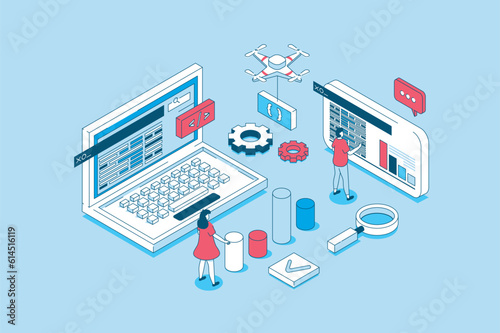 Wall mural devops concept in 3d isometric design. people working with computers, communication and collaboratio - Wall murals Wall mural devops concept in 3d isometric design. people working with computers, communication and collaboratio - Wall murals