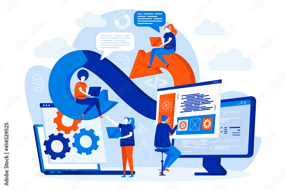 Wall mural : Devops engineers web design with people - devops developers work with computers scene - development op