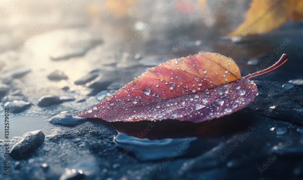 The watermark will not be included on Wall mural.: Dew-covered autumn leaf resting on a textured surface illuminated by soft natural light creating a s