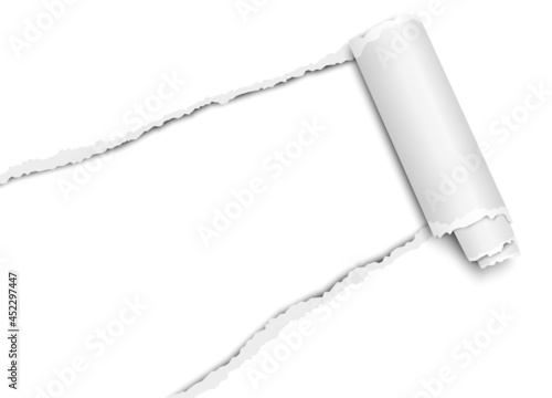 The watermark will not be included on Wall mural.: Diagonally torn hole in transparent sheet of paper from lower left corner with curl, soft shadow and