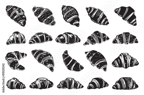 Wall mural : Differents croissants linocut print style icons set varied croissant types neat thick strokes detail