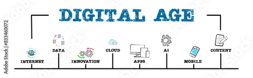 Wall mural digital age concept. illustration with keywords and icons. horizontal web banner