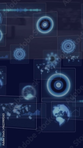 Wall mural digital animation with world maps and target symbols over dark blue background