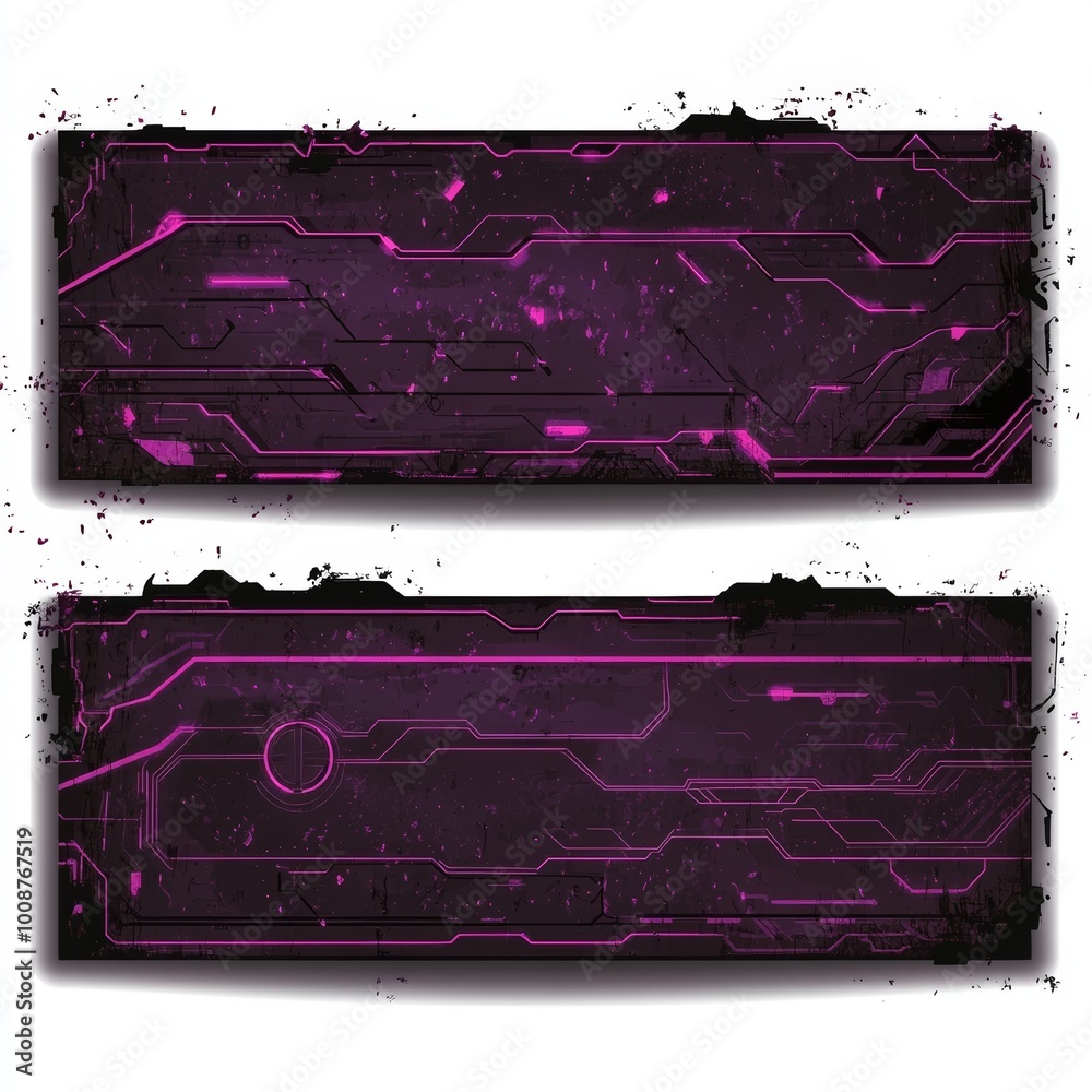 Wall mural digital badges using futuristic hi-tech text boxes with glitched effect in purple.