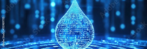 Wall mural : Digital blue water drop icon with binary code, artificial intelligence in water resource management,