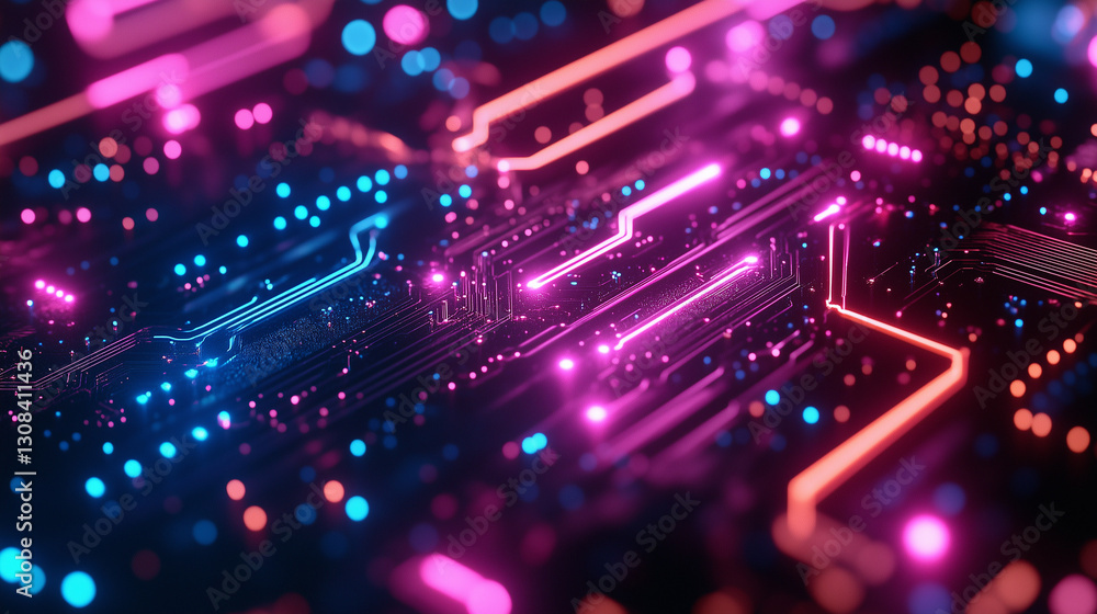 Wall mural digital circuitry: a mesmerizing macro shot showcasing an intricate web of neon circuits and microch - Wall murals Wall mural digital circuitry: a mesmerizing macro shot showcasing an intricate web of neon circuits and microch - Wall murals